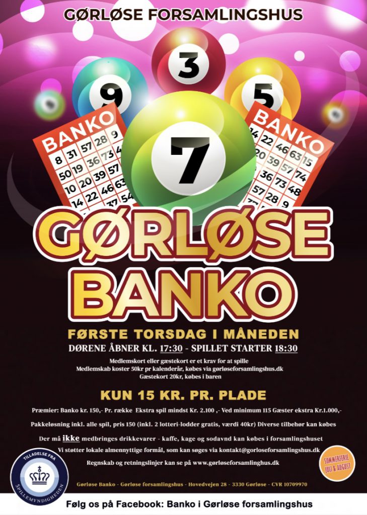 Banko afholdes første torsdag i hver måned på nær juli og August kl. 18.30. Hold øje i facebookgruppen ”Banko i Gørløse forsamlingshus” i tilfælde af ændringer eller aflysninger. For at gennemføre kræver det en del frivillige hænder, så meld dig gerne ved opslag.